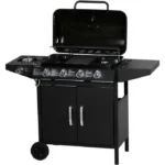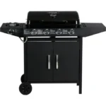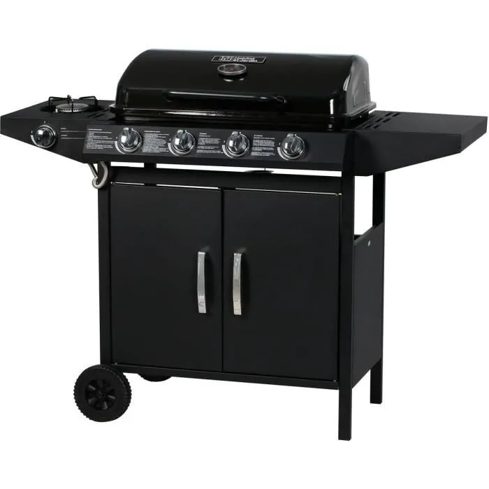 Descriptif Barbecue gaz 5 brûleurs 9.6 kW – Dont 1 brûleur latéral 3.3 kW – Surface de cuisson : 64 x 37 cm – Structure en acier – Grille de cuisson en fer – Bac récupérateur de graisse amovible – 2 roues de déplacement – Tuyau et détendeur non fournis – Grille : 36 x 21.5 cm – Plancha : 35 x 19 cm – Tablette latérale: 36 x 27 cm.